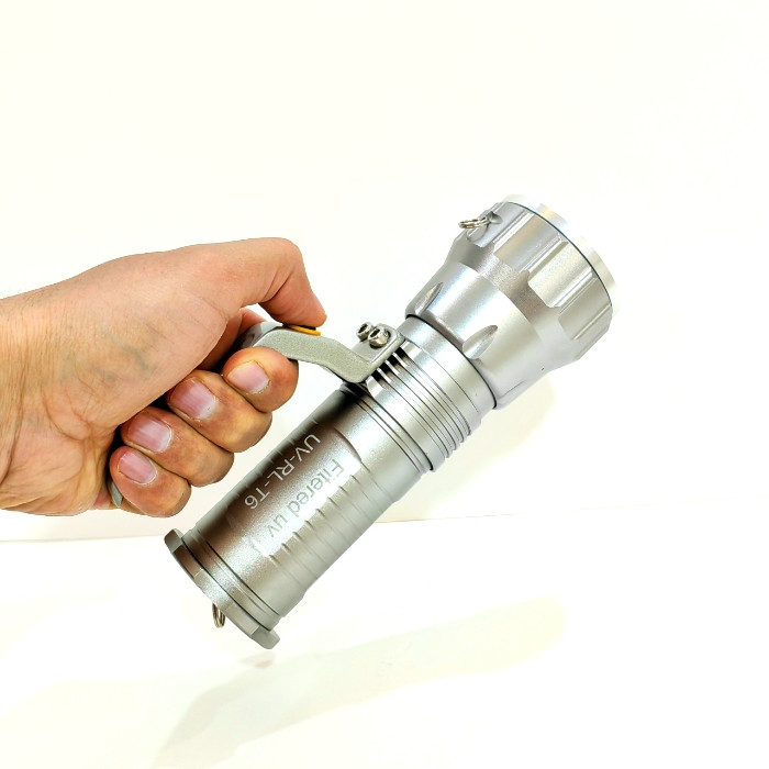 نورافکن دستی حرفه ای فرابنفش مدل UV-RL-T6 دارای چراغ 3 حالته uv پر نور ، کم نور و (چشمک زن) و سه عدد باتری قلمی لیتیومی یون 18650 قابل شارژ، یک وسیله تقریبا کم حجم و پرقدرت.